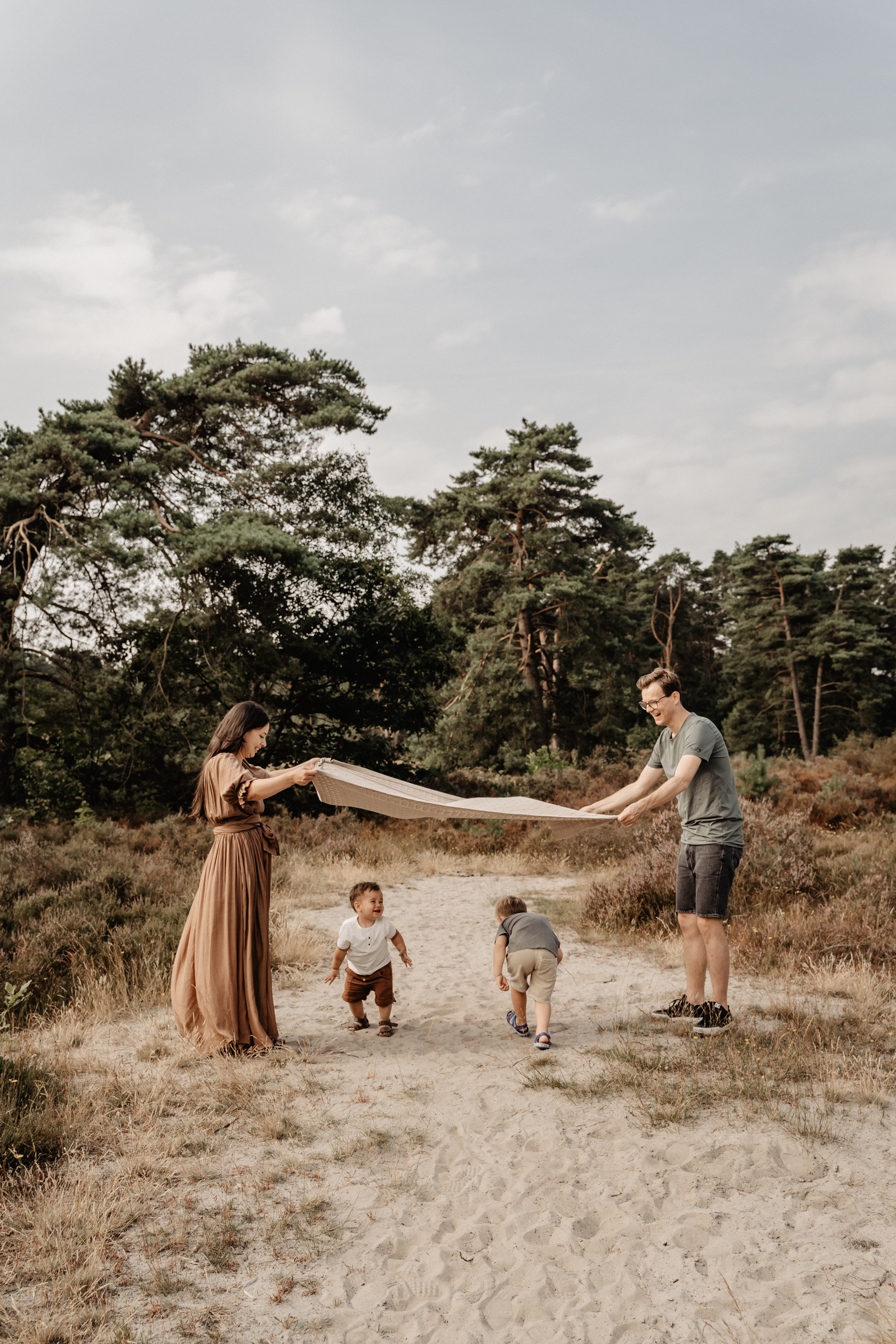 Ik begeleid jullie om spontane beelden vast te leggen door kleine opdrachtjes te geven. De reacties die daaruit voortkomen laat precies zien hoe jullie zijn. De verbinding tussen elkaar en de liefde voor elkaar wordt daarbij vastgelegd. We gaan het vooral leuk met elkaar hebben op een ongedwonge manier. Kindjes willen niet graag stil zitten, daarom gaan we dat ook niet doen! Laat ze maar rennen, dennenappels zoeken, in het zand spelen, in bomen klimmen, tikkertje spelen, papa kietelen, over bommstammen lopen. Ik zal ervoor zorgen dat details worden vastgelegd. Het enige wat jullie moeten doen is genieten van en met elkaar en vooral niet stressen, want kindjes voelen dit aan.